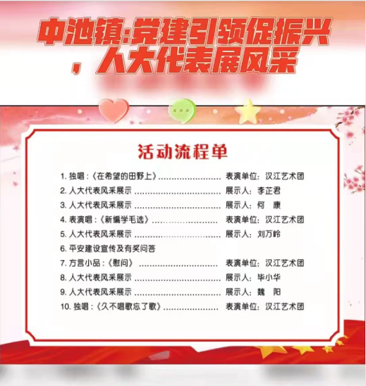 石泉汉江文化艺术团文艺演出志愿者精心编排的节目一一上演。独唱《在希望的田野上》表演单位:汉江艺术团;《人大代表风釆展》展示人:李芷君;《人大代表风釆展》展示人:何康;表演唱:《新疆学毛选》表演单位:汉江艺术团;《人大代表风釆展》展示人:刘万岭;平安建设有奖问答;方言小品:《慰问》表演单位:汉江艺术团;《人大代表风釆展》展示人:毕小华;《人大代表风釆展》展示人:魏阳;独唱:《久不唱歌忘了歌》表演单位:汉江艺术团。演出期间,现场气氛起伏跌宕,中池镇村民干部称赞道:“今天演出精彩,不仅看了表演还受到了教育,触动了心灵”“希望以后能多办一些像这样的演出……”演出结束后,村民们意犹未尽的讨论着。