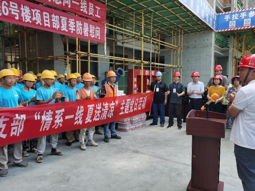 7月7日上午,石泉县住建局质安站携手金江福楼房地产开发公司、建安公司公司党支部相关负责人来到金江龙庭六号楼在建工程现场对一线工人开展“送清凉”慰问活动,将矿泉水、清凉油、洗发露、藿香正气水、毛巾等防暑降温药品送到工人手中,并送上300元现金红包一个,为夏日酷暑里辛勤工作奋战在一线的工人师傅送去“凉”心慰问品。