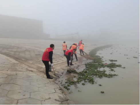(志愿者与环卫工人共同清理沿湖水草)