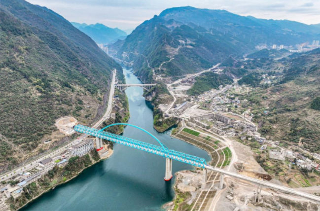 清水坪乌江特大桥位于武陵山区腹地的重庆市彭水苗族土家族自治县境内,是渝湘高铁重庆至黔江段“六隧五桥”之一和全线重难点工程。大桥全长804.6米,主跨240米,一跨过江,为国内首座双Y型单拱肋主拱结构无砟轨道高速铁路桥梁。该项目于2020年开工建设,目前已完成建设进度90%,进入最后收尾阶段。
