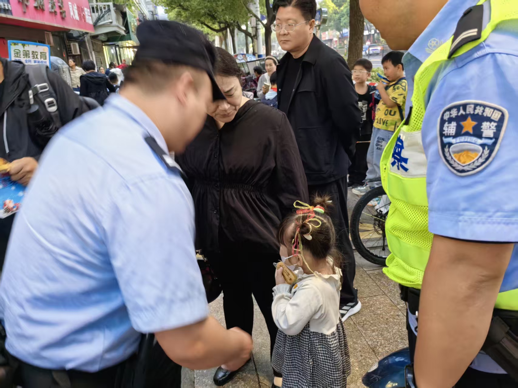 事发当日下午放学时段,民警正在古城小学门口执行护校任务,维护校园周边秩序。期间,一名在校门外独自徘徊、眼角泛泪的小女孩引起了辅警郭继峰的注意,立即上前,蹲下身来耐心安抚女孩的情绪。经细心询问,确认这名小女孩与家人走散,因年龄尚小,无法清楚说出家庭住址和父母的联系方式。