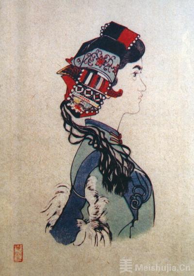 苏州博物馆陈列展览部主任江伟达介绍:“《阿诗玛》其实是黄永玉先生的成名之作,这套作品其实一共有十幅,是一组。这次我们展出了其中的五幅,是黄永玉先生50年代在云南实地采风的过程当中,为撒尼族长篇叙事史诗《阿诗玛》作的插画。可以看到这个第一幅(画)里边,这个上面的头饰是有丰富的民族的纹样,然后这个侧脸又是非常简洁的线条,这一组合就非常具有反差性和冲击力。”