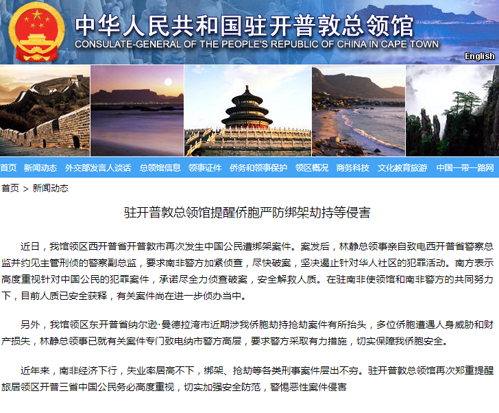 驻开普敦总领馆提醒侨胞严防绑架劫持等侵害