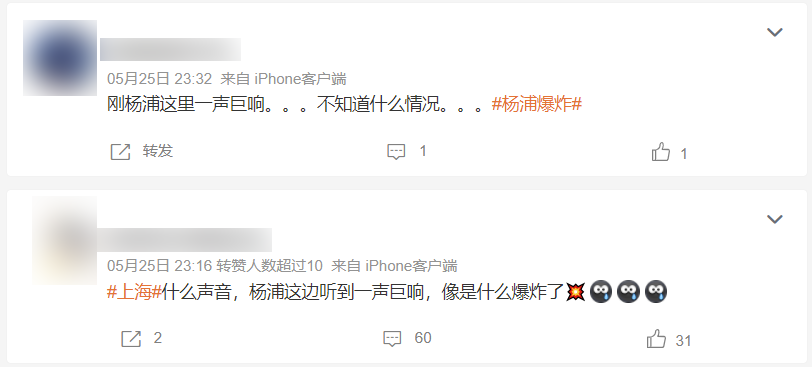 5月25日晚11时左右,网传在上海杨浦听到巨响,疑发生爆炸。有网友称:“刚刚江浦路这边能听到类似爆炸的声音,还断电断网了,太吓人了。”
