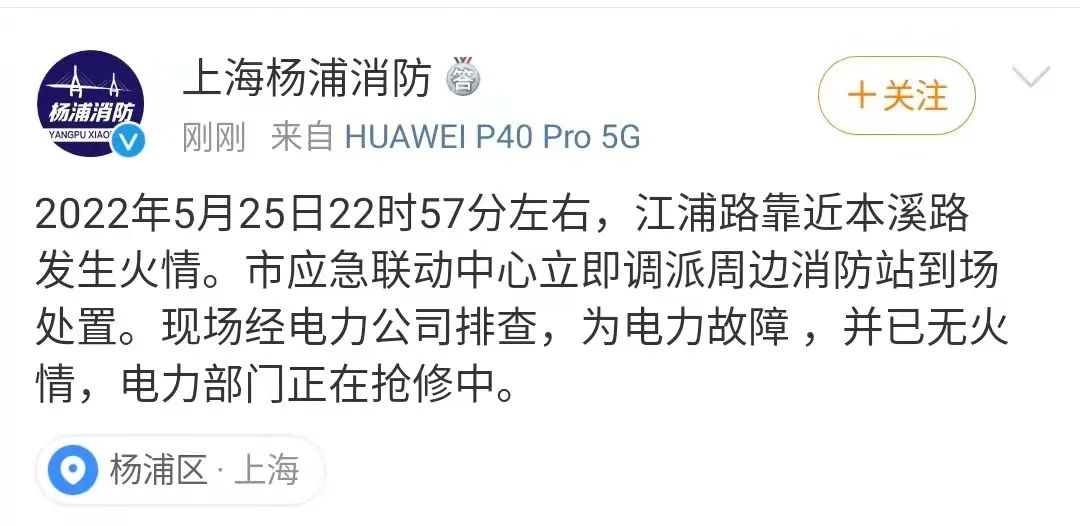 对此,记者从上海杨浦消防获悉,2022年5月25日22时57分左右,江浦路靠近本溪路发生火情。市应急联动中心立即调派周边消防站到场处置。现场经电力公司排查,为电力故障 ,并已无火情,电力部门正在抢修中。