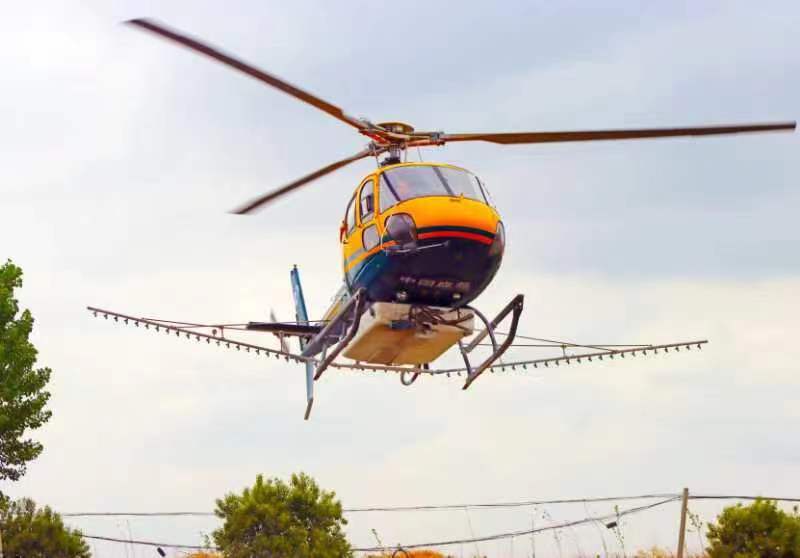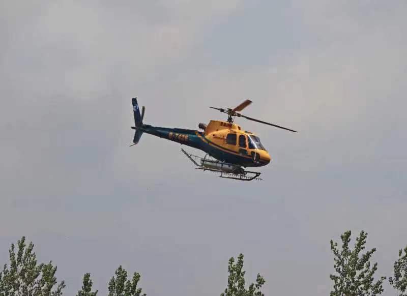 同时还调用一架鲁翼通航B——7426直升飞机进行药物喷洒。凤台县是全国平原绿化先进县和安徽省创森先进单位,每年夏季约有40万亩林木和农作物需要进行高空统防统治喷洒防治工作。图为直升飞机在岳张集镇上空对当地林木进行飞防喷药时的情景。